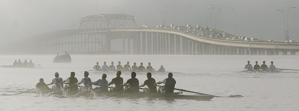 2010 nominee the UW mens' crew team practice on Lake Washington in the early morning as commuters drive over the Evergreen Point Bridge.( Dan DeLong/Seattle Post-Intelligencer)