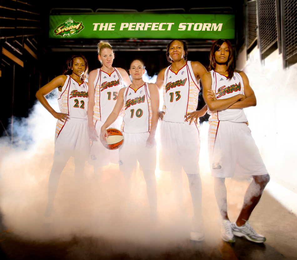 2010 nominee Swin Cash (far right) along with the rest of her the Seattle Storm high profile starting five (from left to right) Sheryl Swoopes, Lauren Jackson (2003 winner), Sue Bird (2002 winner), Yolanda Griffith and Cash photographed at Key Arena in Seattle.(Scott Eklund/Seattle Post-Intelligencer)