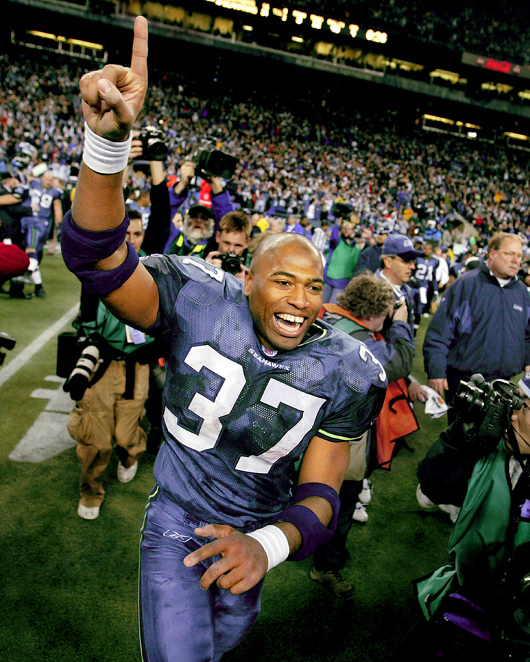 Seems like a while ago as 2005 Sports Star of the Year Running back Shaun Alexander ran onto the field after time expired at the NFC Championship game won by the Seattle Seahawks over the Carolina Panthers at Qwest Field. (Scott Eklund/Seattle Post-Intelligencer)