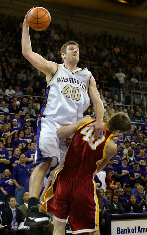 2008 winner Jon Brockman drives over USC's Greg Gaudino on the way to the basket in the game won by the UW over USC 87-73. (Scott Eklund/Seattle Post-Intelligencer)