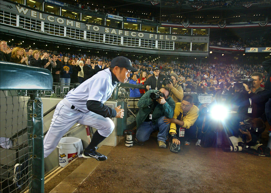 I have two favorite Ichiro pictures, so you get to see them both, here he runs onto the field as he is introduced on opening day of the 2006 season. (Scott Eklund/Seattle Post-Intelligencer)