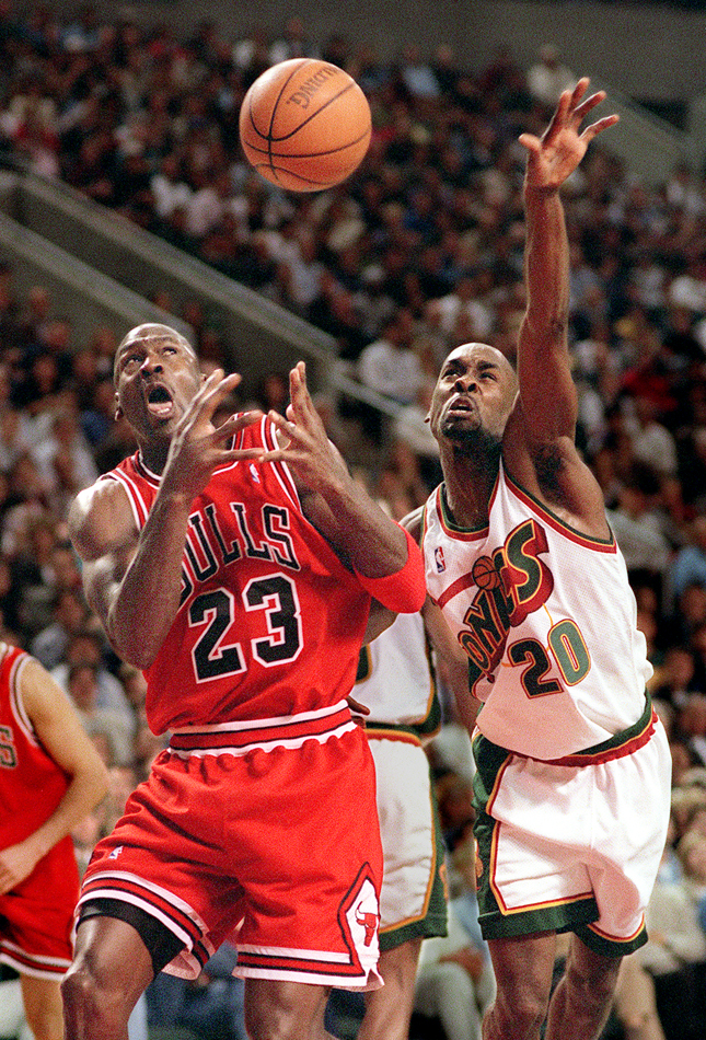 1997 SSY winner Gary Payton swipes the ball from MJ during the 1996 season that saw Jordan's bulls top the Sonics in the NBA Finals. (Scott Eklund/Seattle Post-Intelligencer)