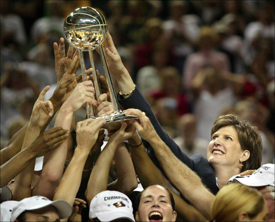 2004 SSY winner Seattle Storm Coach Anne Donovan reaches out to touch the championship trophy in 2004 as she became the first woman head coach to win the WNBA title. (Scott Eklund/Seattle Post-Intelligencer)
