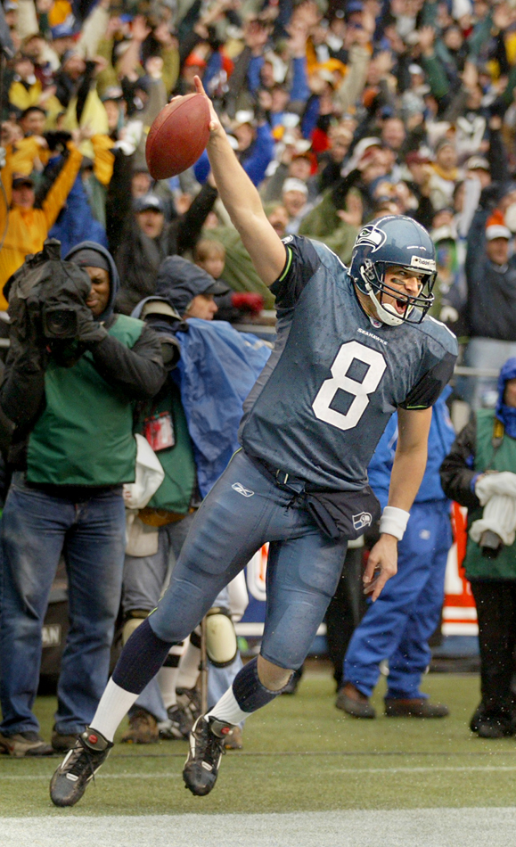 2003 SSY winner quarterback Matt Hasselbeck celebrates his third quarter touchdown on a six yard run to put the Seahawks ahead 14-3 during the Seattle 20-10 over the Washington Redskins in the NFC Divisional Playoff game (Scott Eklund/Seattle Post-Intelligencer)