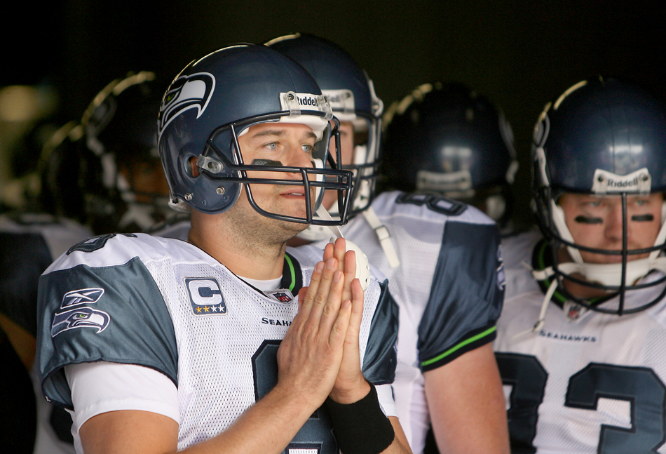 One of the great things about covering Matt Hasselbeck was you could always get your game photo from him because he always wore his emotions out in the open. Here he waits in the tunnel before the start on the game as his prayers went unanswered as the Seattle Seahawks lost to the New York Giants 44-6 at Giants' Stadium in East Rutherford, NJ in 2008(Scott Eklund/Seattle Post-Intelligencer)