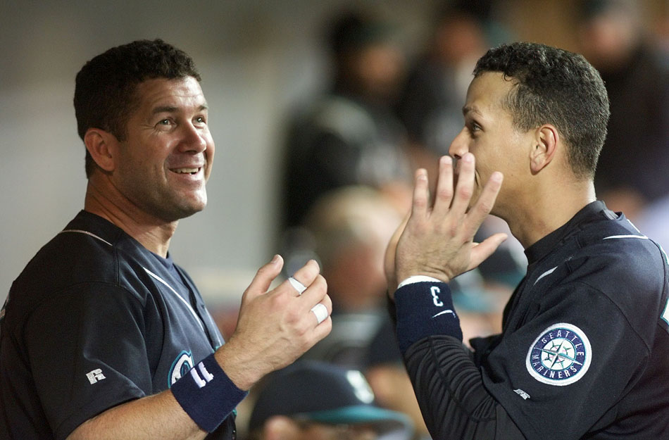 1992 & 1996 P-I SSY Edgar Martinez and Alex Rodriguez chat in the dugout during the 2000 season (Dan DeLong/Seattle Post-Intelligencer