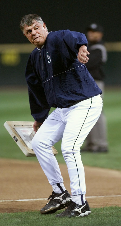 1995 SSY winner Mariners' manager Lou Piniella throws first base in a fit of rage after a bad call cost him a game in the 2002 season. (Dan DeLong/Seattle Post-Intelligencer)