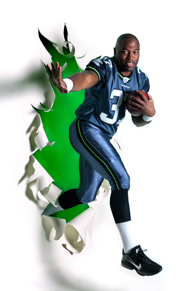 The 2005 Sports Star of the Year was Seahawks running back Shawn Alexander, photographed breaking out of the newspaper for a P-I season-opening special section in 2007. (Andy Rogers/Seattle Post-Intelligencer)