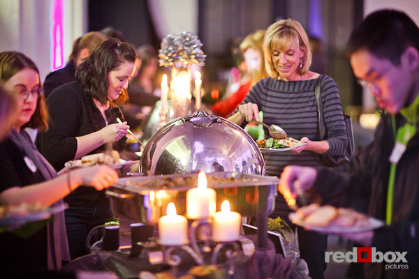 Guests serve themselves from a buffet prepared by A Grand Affaire Catering at "RE-New", their Winter Open House and Complimentary Tasting, the Engine Room in Georgetown Studios in Seattle. (Photo by Red Box Pictures)