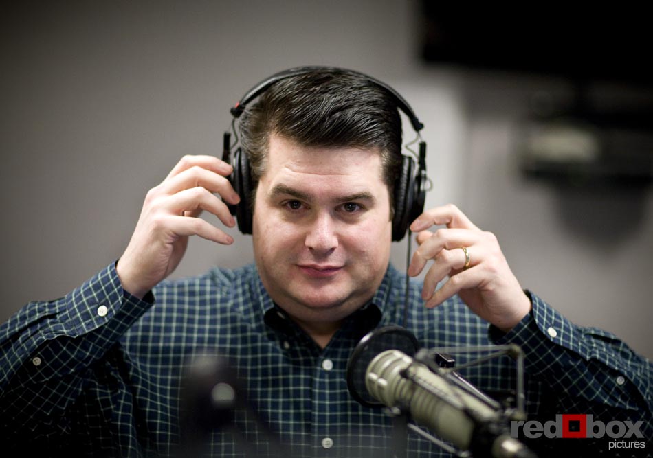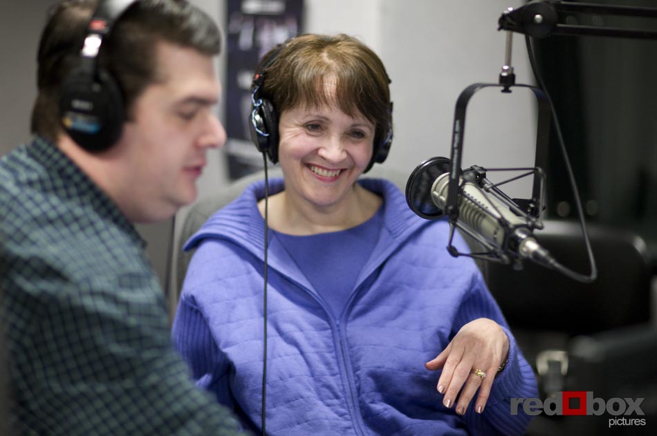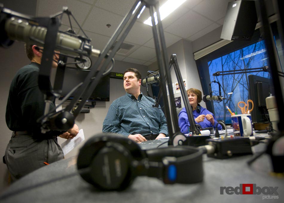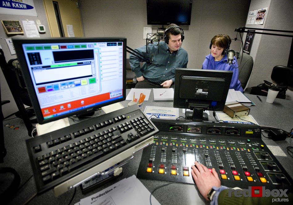 Nearlywed Radio, a program featuring Seattle wedding industry pros offering tips, tricks and other information for brides, is all set to air its first show. Red Box Pictures’ own Scott Eklund will be the featured Seattle wedding photographer on the inaugural broadcast. The show will air Saturday (2/13) on KKNW 1150 AM from 11 AM to noon and also online live at http://www.1150kknw.com/listenlive.asp. Scott’s segment will air at approximately 11:40 am. If you happen to miss the show on Saturday Nearlywed Radio will have the show posted on its website by Monday. The show will air every Saturday in the 11 am-noon time slot, and will discuss a variety of topics dealing with weddings. The first show will also feature Janel Schlitt, owner of Occasions Wedding and Event Planning and Eddie Redman of Grand Event Rentals. Two longtime and well-respected Seattle area wedding professionals will be hosting the show: Gayle O’Donnell owner of All About Weddings & Celebrations and DJ Greg Lowder of Affairs to Remember. Here are a few images of Gayle and Greg in action, taken by Scott during show production. –Andy Rogers