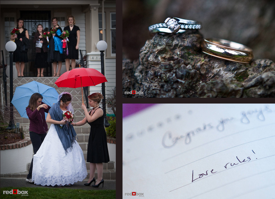 Left and clockwise- Merilee's bridesmaids hold umbrellas for her as she heads off to her wedding (Photo by Rob Sumner/Red Box Pictures) Merilee and Phil's wedding rings (Photo by Andy Rogers) A guest's sentiment in the bride and groom's guest book (Photo by Andy Rogers)