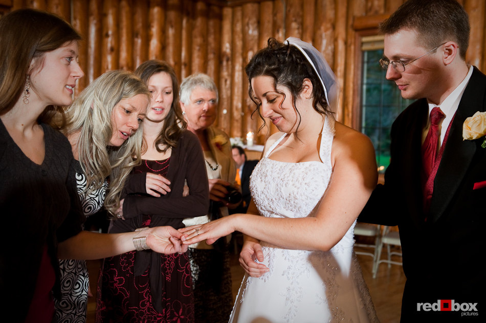 Guest look at Marilee's wedding ring, after she and Phil were married at Hillcrest Lodge in Mt. Vernon, WA. (Photography by Rob Sumner / Red Box Pictures)