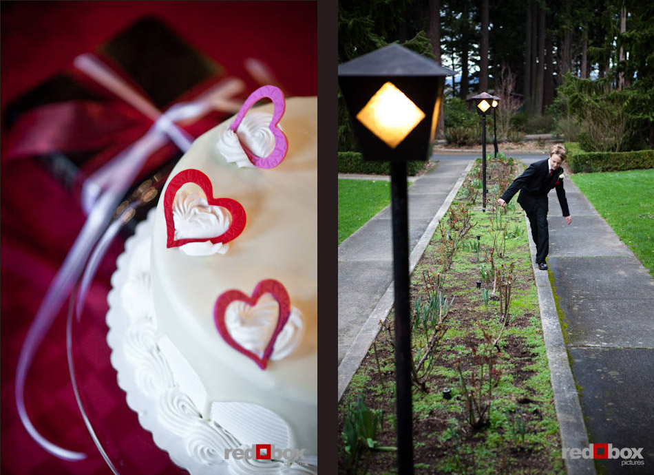 Left - Marilee and Phil's wedding cake sits next to a Bible given to them during their ceremony at Hillcrest Lodge in Mt. Vernon, WA. Right- A guest balances in front of Hillcrest Lodge. (Photos by Andy Rogers/Red Box Pictures)