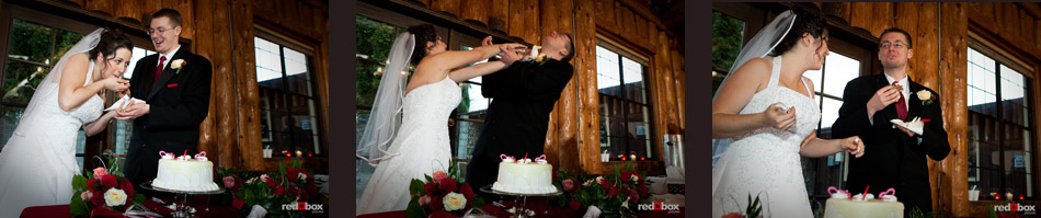 Phil and Marilee have fun with the cake cutting after being married at Hillcrest Lodge in Mt. Vernon, WA. (Photography by Rob Sumner / Red Box Pictures)