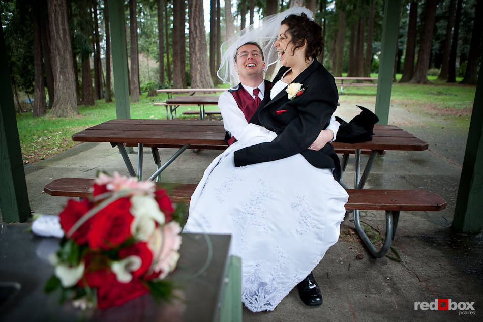 Merilee and Phil laugh as they sit alone at Hillcrest Park immediately after being married at Hillcrest Lodge in Mt. Vernon, WA. (Photography by Andy Rogers/Red Box Pictures)