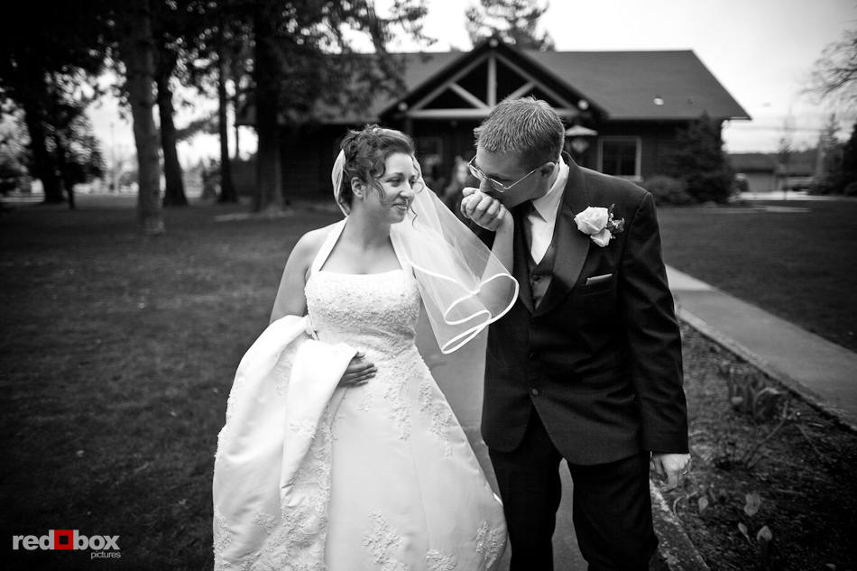 Phil kisses Marilee's hand moments after they were married at Hillcrest Lodge in Mt. Vernon, WA. (Photography by Andy Rogers/Red Box Pictures)