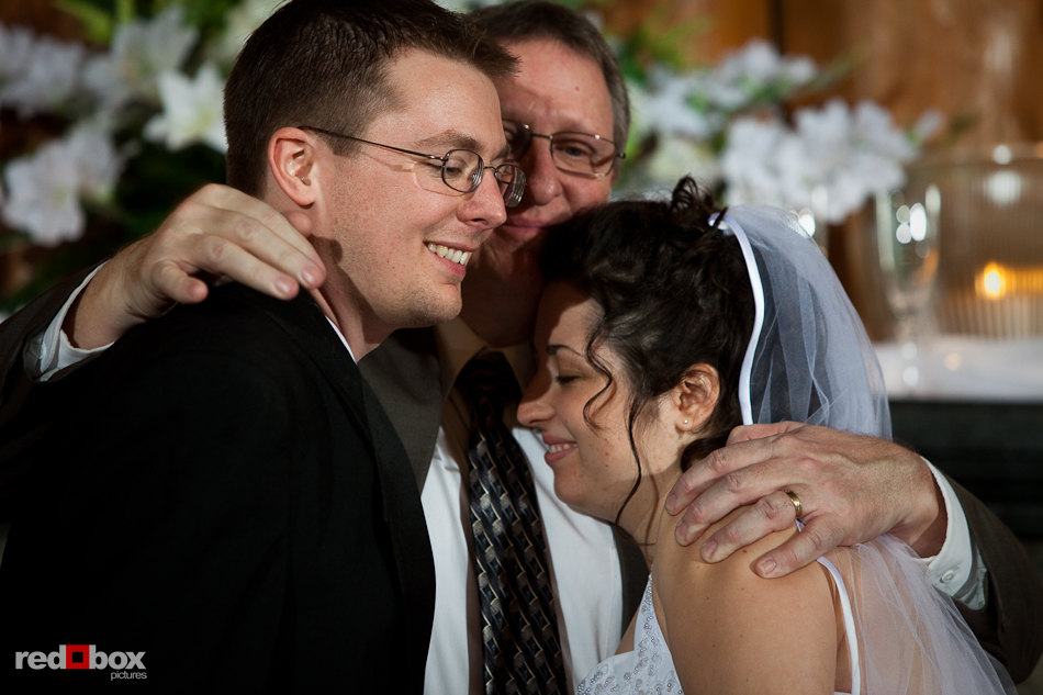 Phil and Marilee get a hug from their officiant after being married at Hillcrest Lodge in Mt. Vernon, WA. (Photography by Rob Sumner / Red Box Pictures)