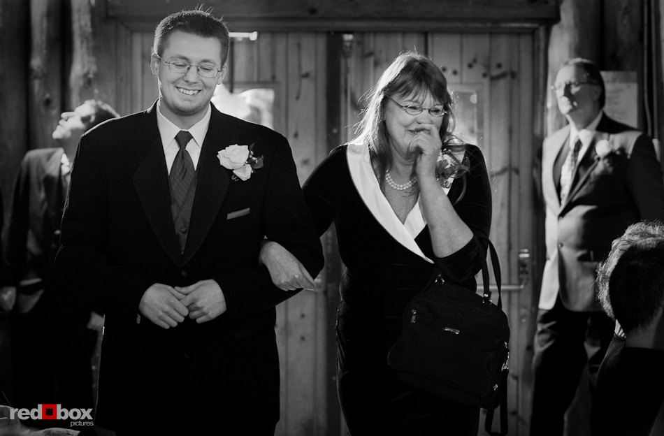 Phil the groom escorts his mom to her seat before the wedding ceremony at the Hillcrest Lodge in Mt. Vernon, WA. (Photography by Rob Sumner / Red Box Pictures)