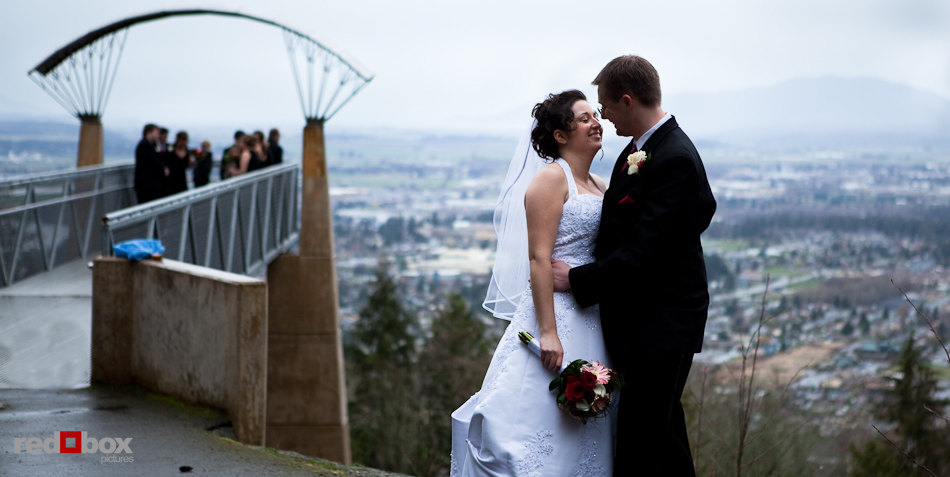 Marilee and Phil stand in the rain overlooking Mt. Vernon, WA from a viewpoint at the top of Little Mountain prior to their wedding at Hillcrest Lodge. (Photography by Andy Rogers/Red Box Pictures)