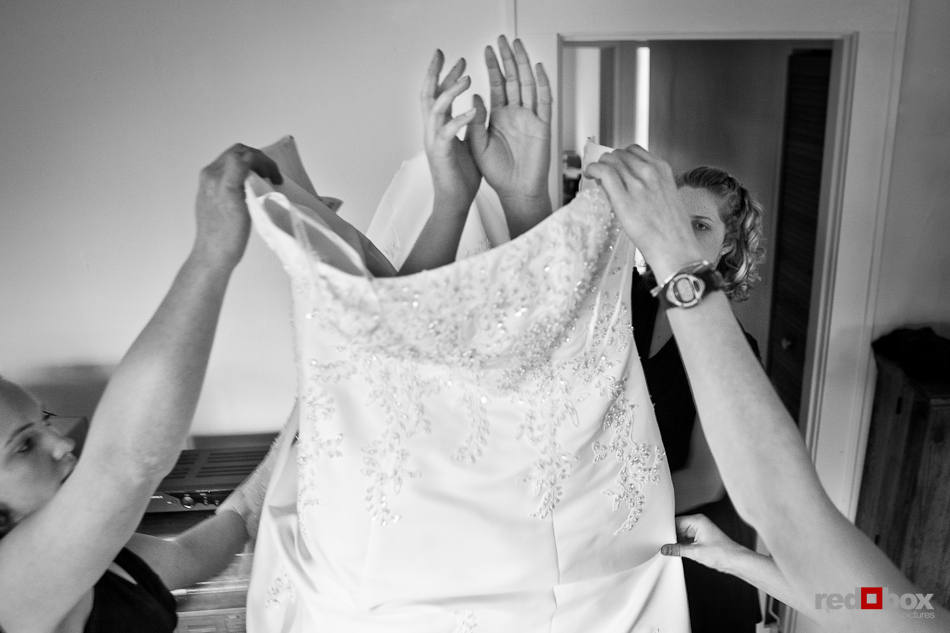 Merilee's bridesmaids help her put on her wedding dress at her home in Mt. Vernon, WA. (Photography by Andy Rogers/Red Box Pictures)