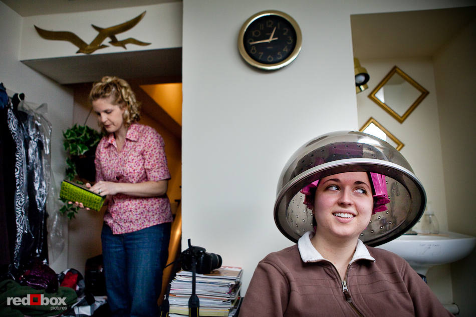 With pink curlers in her hair, bride Merilee sits beneath a hair dryer prior to her wedding at Hillcrest Lodge in Mt. Vernon, WA. (Photography by Andy Rogers/Red Box Pictures)