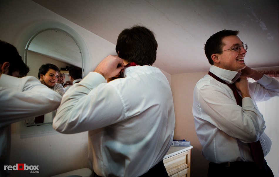 Phil the groom, right, gets ready with groomsmen before his wedding at the Hillcrest Lodge in Mt. Vernon, WA. (Photography by Rob Sumner / Red Box Pictures)