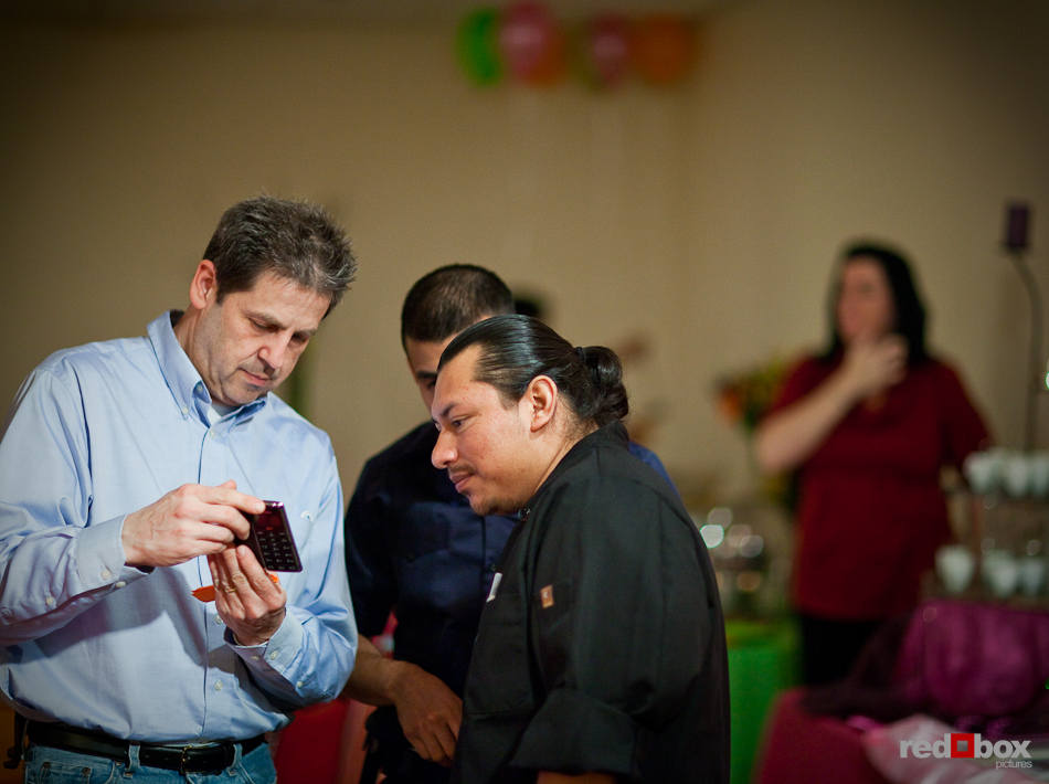 James Royal of Illustrations in Ice shows potential clients photos of his ice carvings on his phone at the open house at Seattle Scottish Rite Masonic Center.