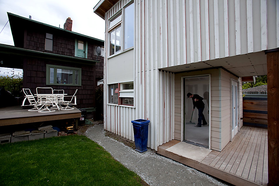 John Stoeck sweeps up inside a cottage currently under construction in his back yard in Seattle, WA. Stoeck plans to rent the unit when complete. He lives with his wife and son in the main house visible to the left. Photo by Rob Sumner / Red Box Pictures.