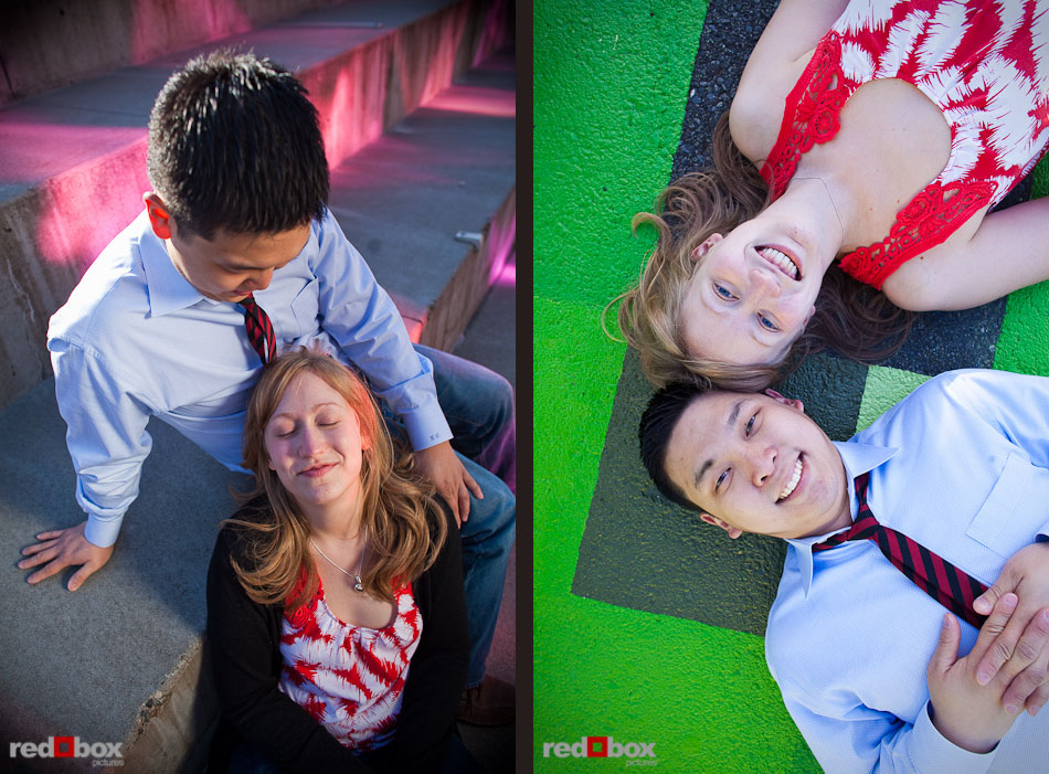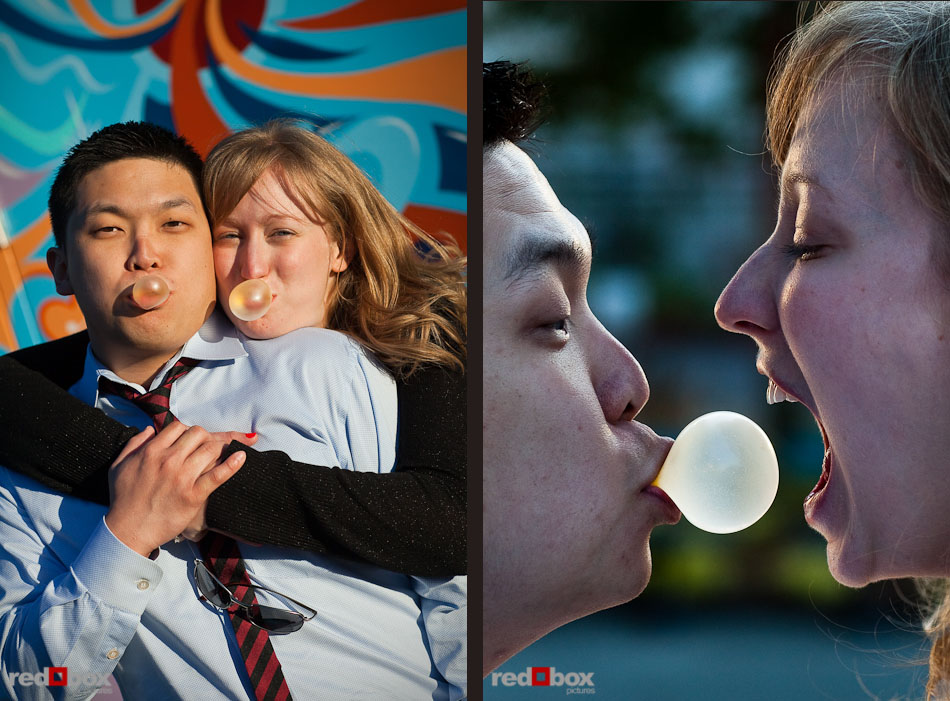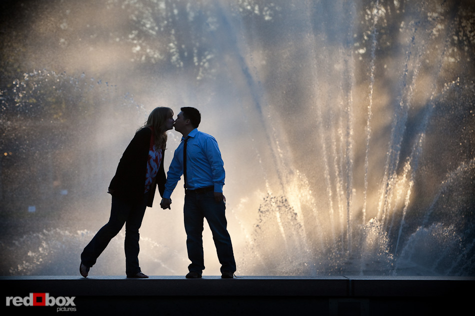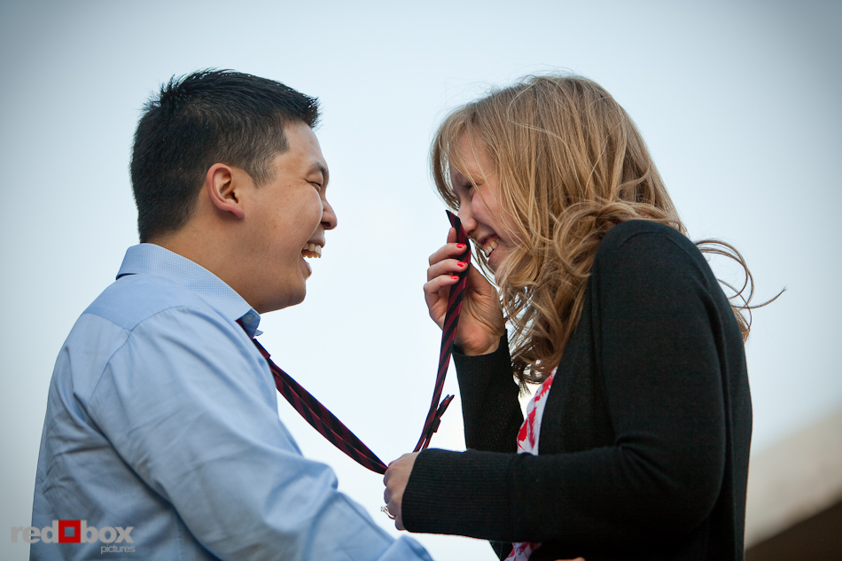 Eugene taught Jenny to blow bubbles on one of their early dates, and the couple wanted to re-capture the fun of that time with their engagement photos. The Seattle Center and the new interactive features located on the former location of the Fun Forest were perfectly suited to their goal. Thanks to Eugene’s tutoring, Jenny created some nice bubbles! It was great to get to know this playful, energetic couple…their Newcastle Golf Club wedding in August is going to be terrific fun. –Andy