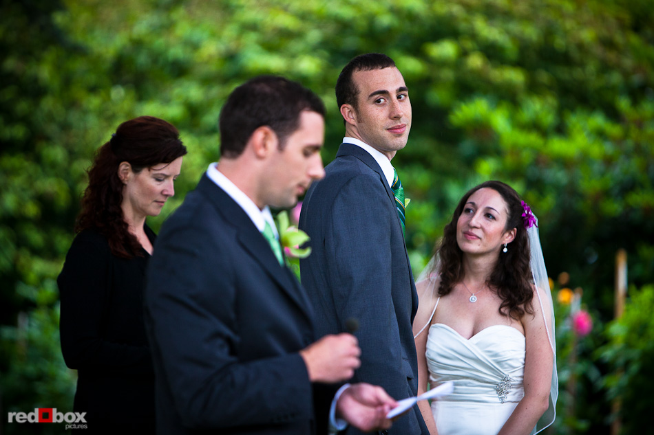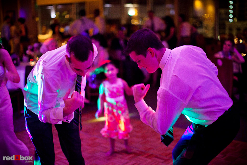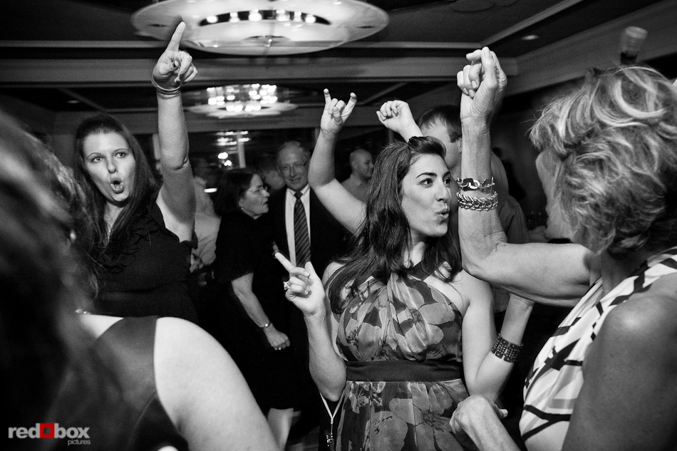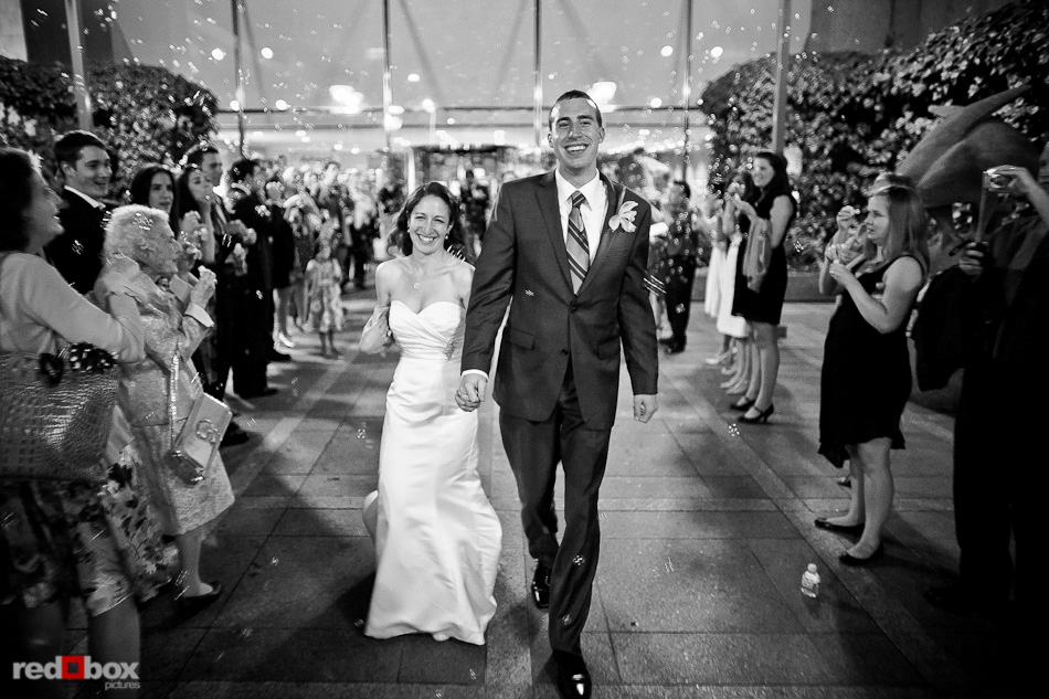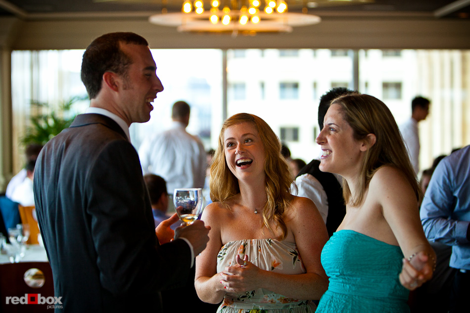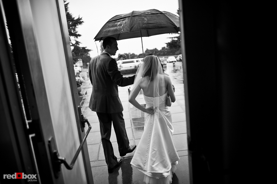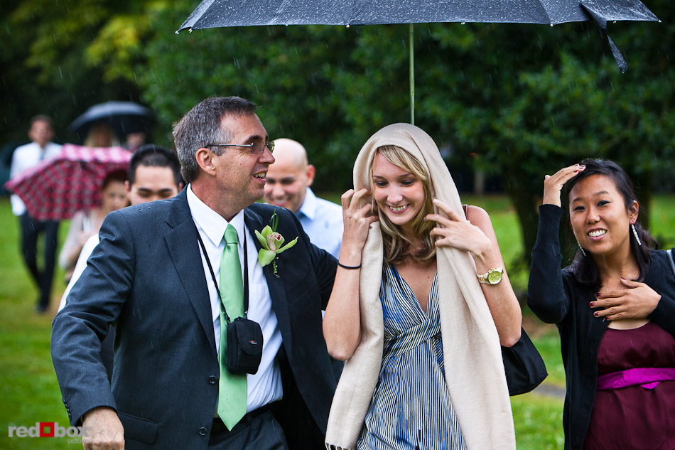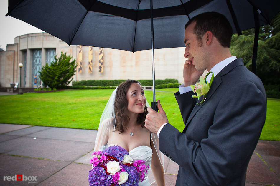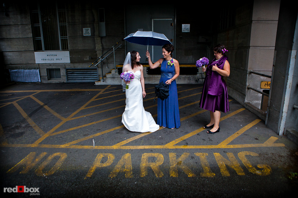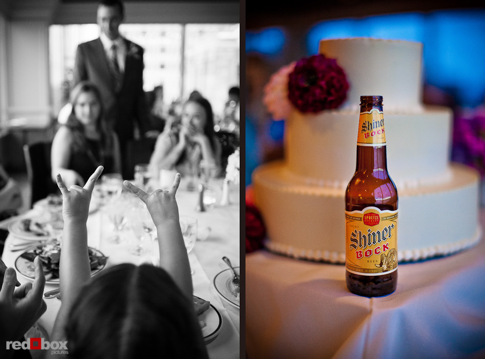 Emily and Will met as students at the University of Texas at Austin, and being a fellow Longhorn, I felt an immediate connection to them. We had a lot of fun as I got to know them during their engagement session, and I expected more of the same at their wedding. The couple, their family and guests didn’t disappoint. Despite a heavy downpour, Will and Emily managed to keep all their guests dry as they were married in one of my favorite Seattle places, Volunteer Park. A huge evergreen kept the rain off the couple, their officiant and wedding party, while rented tents provided cover for the guests and musicians. Afterward, a limousine took them to the Harbor Club, where Texas’ favorite beer, Shiner Bock was served alongside terrific food and wedding cake. A number of guests were seen flashing the Hook’Em Horns, and almost all danced into the night. | Andy Rogers