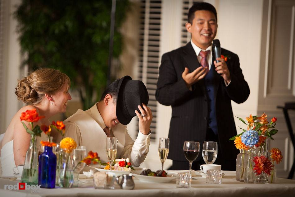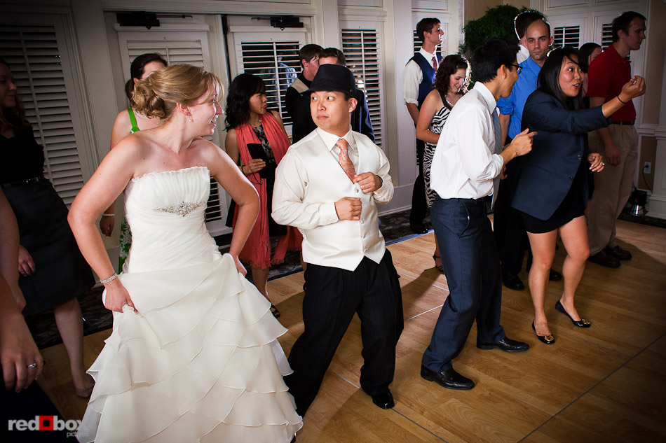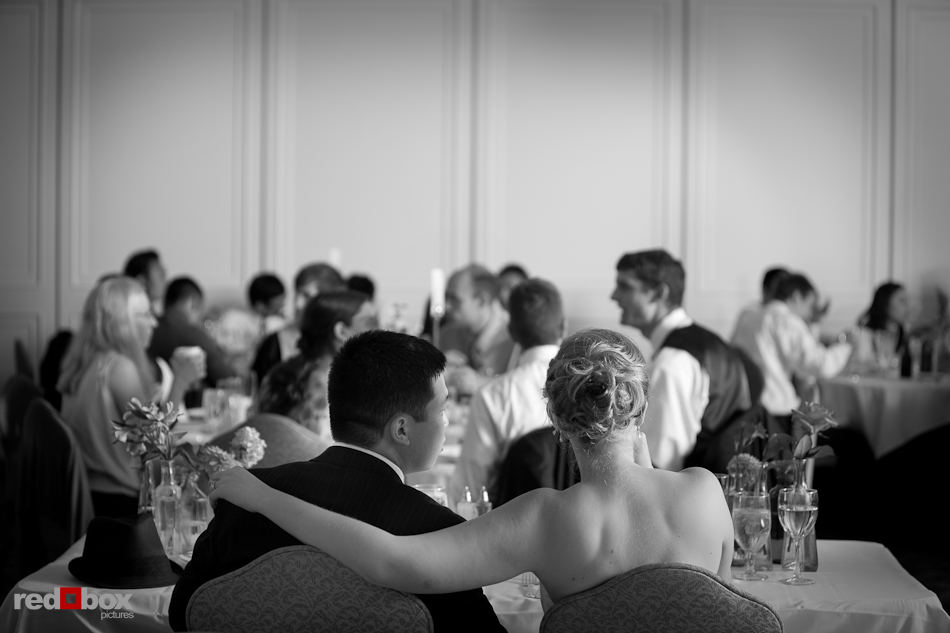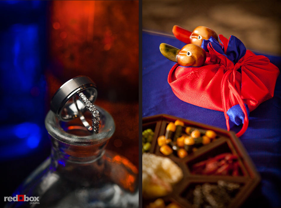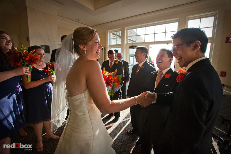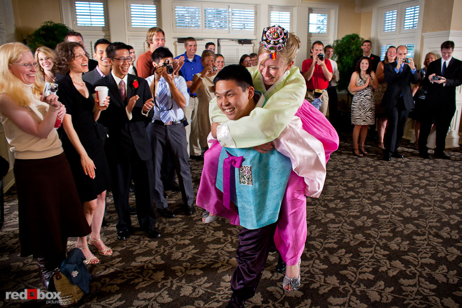 Jenny and Eugene officially joined their lives together with two weddings in one afternoon at The Golf Club at Newcastle. The first was a traditional western ceremony held on the patio with views of Seattle and Bellevue. The second was a Korean tea ceremony that culminated with Eugene carrying his bride around the room on his back to the delight of his guests and family. I knew from doing their Seattle Center engagement photos that the couple was kind and fun-loving. Rob Sumner and I expected the same from their ceremony and weren’t disappointed by their jovial, stress-free day spent with terrific friends. | Andy Rogers