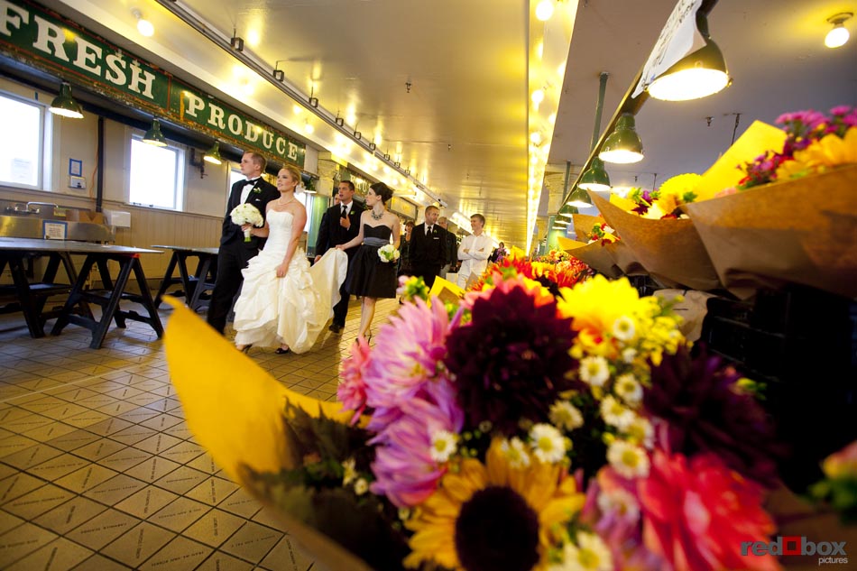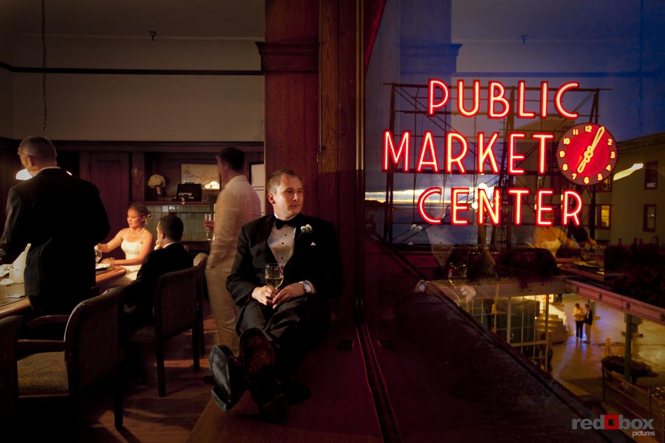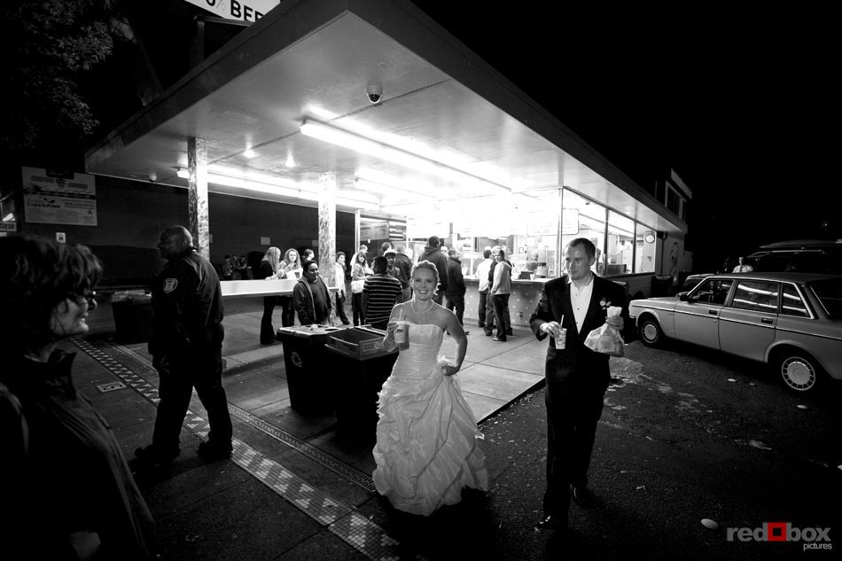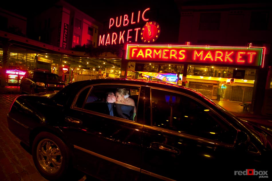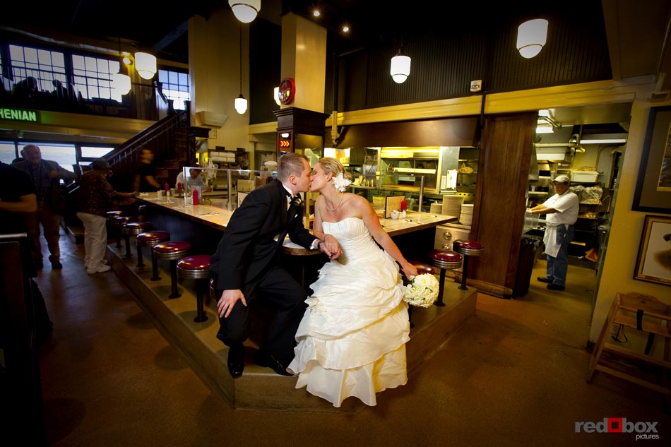 Arielle and Garth had a great wedding day that started out at the Fairmont Olympic Hotel in Seattle and finished up at Dick’s Drive-In on Capitol Hill. The couple saw each other for the first time outside the Georgian Room at the Fairmont, before taking a limo ride with their wedding party to the Pike Place Market. A nice walk through the market took us to the wedding destination, the Top of the Market. Jessica Obrist of Jo Jo Stiletto Events kept everything running smoothly and on-time at this intimate venue where the food and atmosphere were terrific. Great action on the dance floor was a credit to the wonderful DJs from Gen X Pro and also to the lively friends and family of Arielle & Garth! What wedding wouldn’t be complete without a stop at Dick’s Drive-In on Capitol Hill for burgers, fries and a shake. What a fun night! Scott Eklund